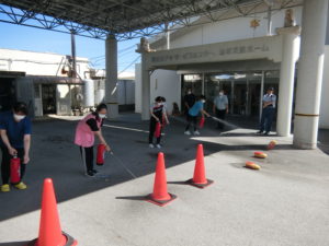 令和7年度第1回の防火避難訓練を行いました。今回は地震災害を想定しての訓練を行ない、島尻消防署員、安里区長様も参加いただきました。また沖縄ホーチキ様より、基本的な消火器の取り扱いや消防設備等の説明もいただき、今後も細心の注意をはらいながら日々の防火や災害に留意し、安心・安全な施設運営を継続していきたいと思います。